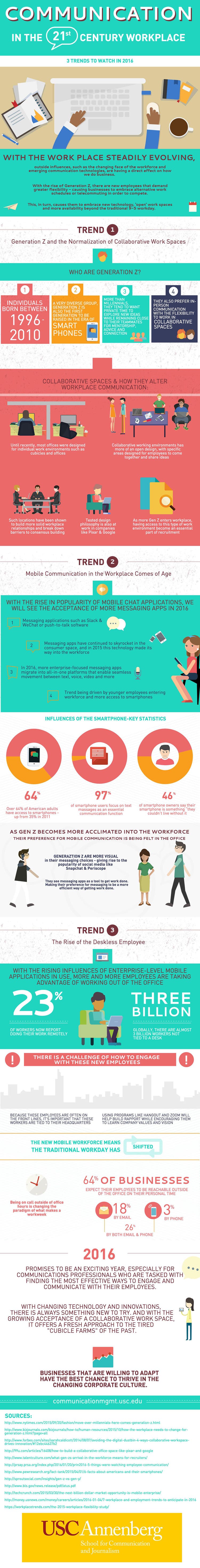 Your work as an online communications student offers unique insights into the importance of efficient interactions at work. In our latest infographic, we highlight the three most important trends impacting 21st workplace communication offers future virtual employees and employers important skills and tools for success. Learn more in the infographic below:
