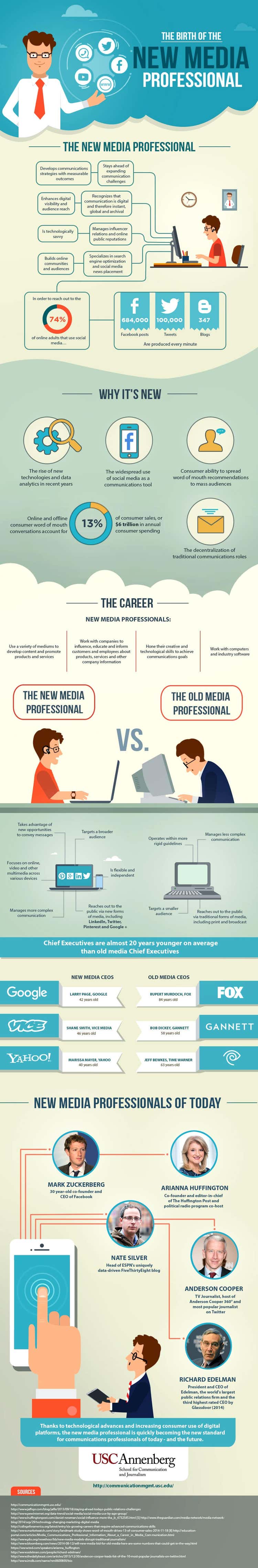 The rise of new technologies, social media channels and data analytics tools has changed the media world forever. With hundreds of thousands of pieces of content being produced and shared every minute, media is becoming both more flexible and more complex. As the rigidity and tradition of old media become marks of the past, we are experiencing the rise of the new media professional. In the infographic below, see what this means for you as you pursue your online degree in Communication Management: