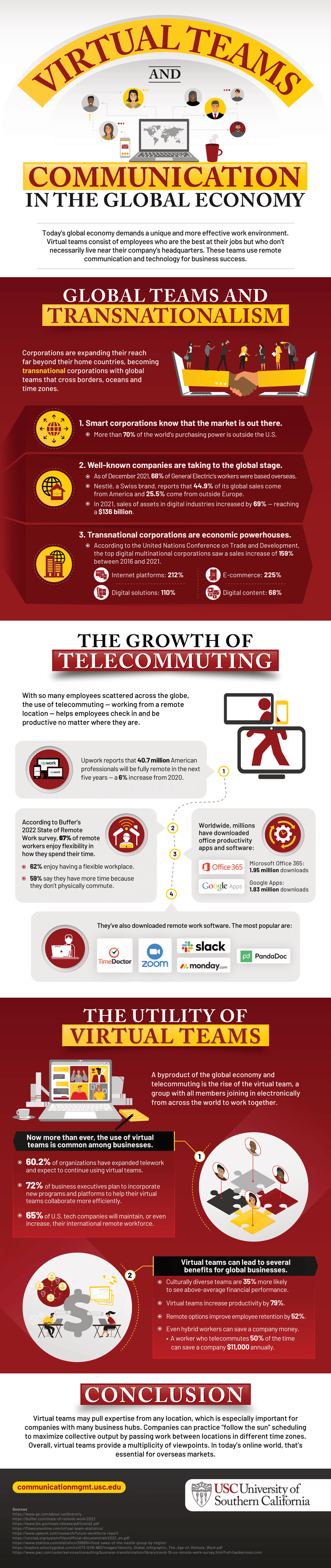 A byproduct of the global economy and telecommuting is the rise of the virtual team, a group with all members joining in electronically from across the world to work together. Now more than ever, the use of virtual teams is common among businesses. The U.S. Bureau of Labor Statistics reports that 60.2% of organizations have expanded telework and expect to continue using virtual teams. In the future, 72% of business executives plan to incorporate new programs and platforms to help their virtual teams collaborate more efficiently, and 65% of U.S. tech companies will maintain, or even increase, their international remote workforce.